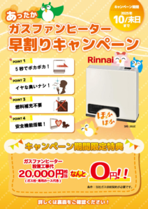 フジタグループでは、10月末まで「ガスファンヒーター早割りキャンペーン」を実施しております。