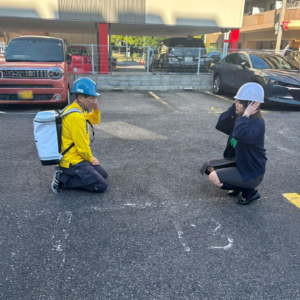 徳島事務所では、地震・津波発生を想定し、即時行動としてヘルメットを着用後、建物から駐車場へ速やかに避難。