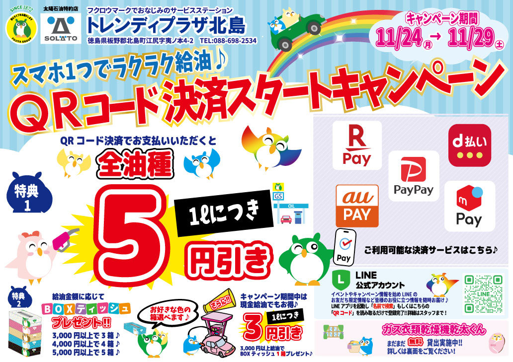 フクタロウマークでお馴染みのSOLATOサービスステーション「トレンディプラザ北島」にて「QRコード決済スタートキャンペーン」を開催いたします!