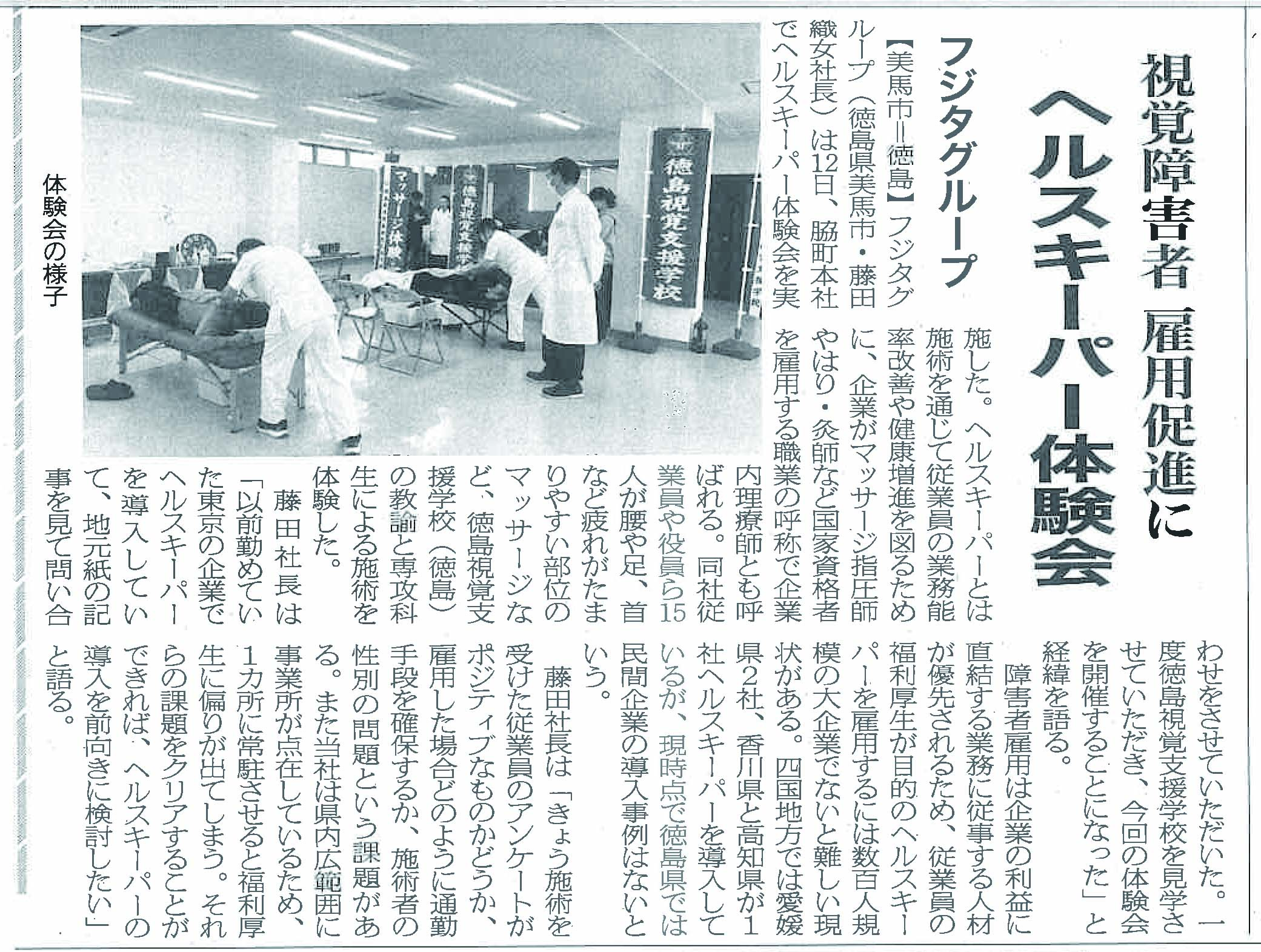 本体験会は、視覚障害者の雇用促進および従業員の健康増進を目的とし、徳島視覚支援学校の教諭・専攻科生の皆さまにご協力いただきながら、企業内理療の可能性を体験していただく取り組みです。