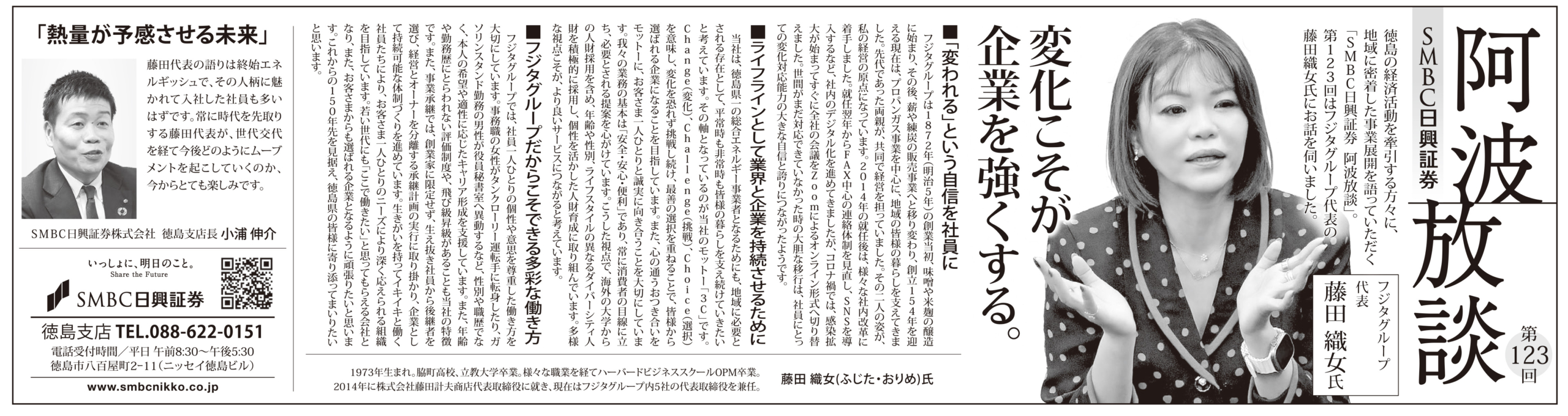 徳島の経済活動を牽引する方々に、地域に密着した事業展開を語っていただく「SMBC日興証券 阿波放談」のコーナーに、 SMBC日興証券 徳島支店 支店長 小浦伸介様 と弊社代表 藤田織女の対談が掲載されました。