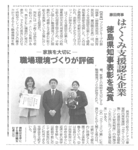 徳島県知事表彰(はぐくみ支援企業)を受賞しました
